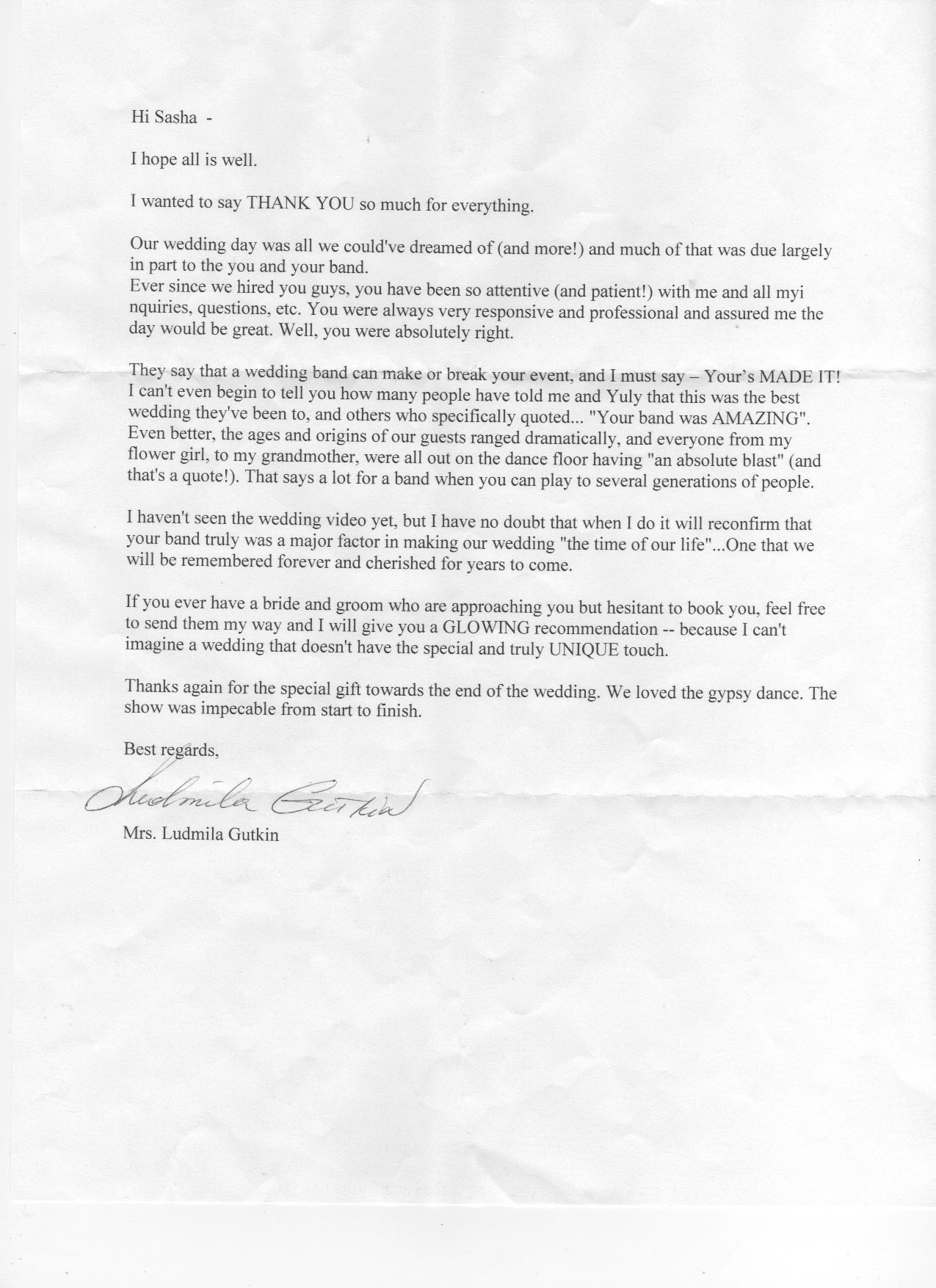 I just want to thank your band for being so great. I hired you because I saw you perform at my friend’s wedding last year and I really liked you. Everyone was impressed with your performance at my wedding and you truly made it special giving me a variety of music-anything from Italian, American to great popular Russian songs. Sasha is easy to deal with and is very flexible. He made sure everyone was enjoying the music and dancing. The violinist is very talented and he was simply amazing! The dancers were great, the singers could sing a variety of things and had great voices. The show was very good. Thanks so much for everything! I am highly recommending you to anyone who needs a band/show at their special event!