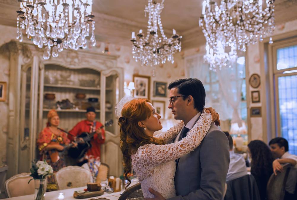 The wedding celebration at Mari Vanna, a restaurant in the Flatiron district with a heavy Russian accent. The celebration included jugs of vodka and a continuous loop of folk songs from the old country performed by NY Balalaika Duo Mikhail Smirnov and Elina Karokhina. Of her new husband, Ms. Berestovskaya said, "He taught me how to love." Photo Credit: Jessica Lehrman for The New York Times.