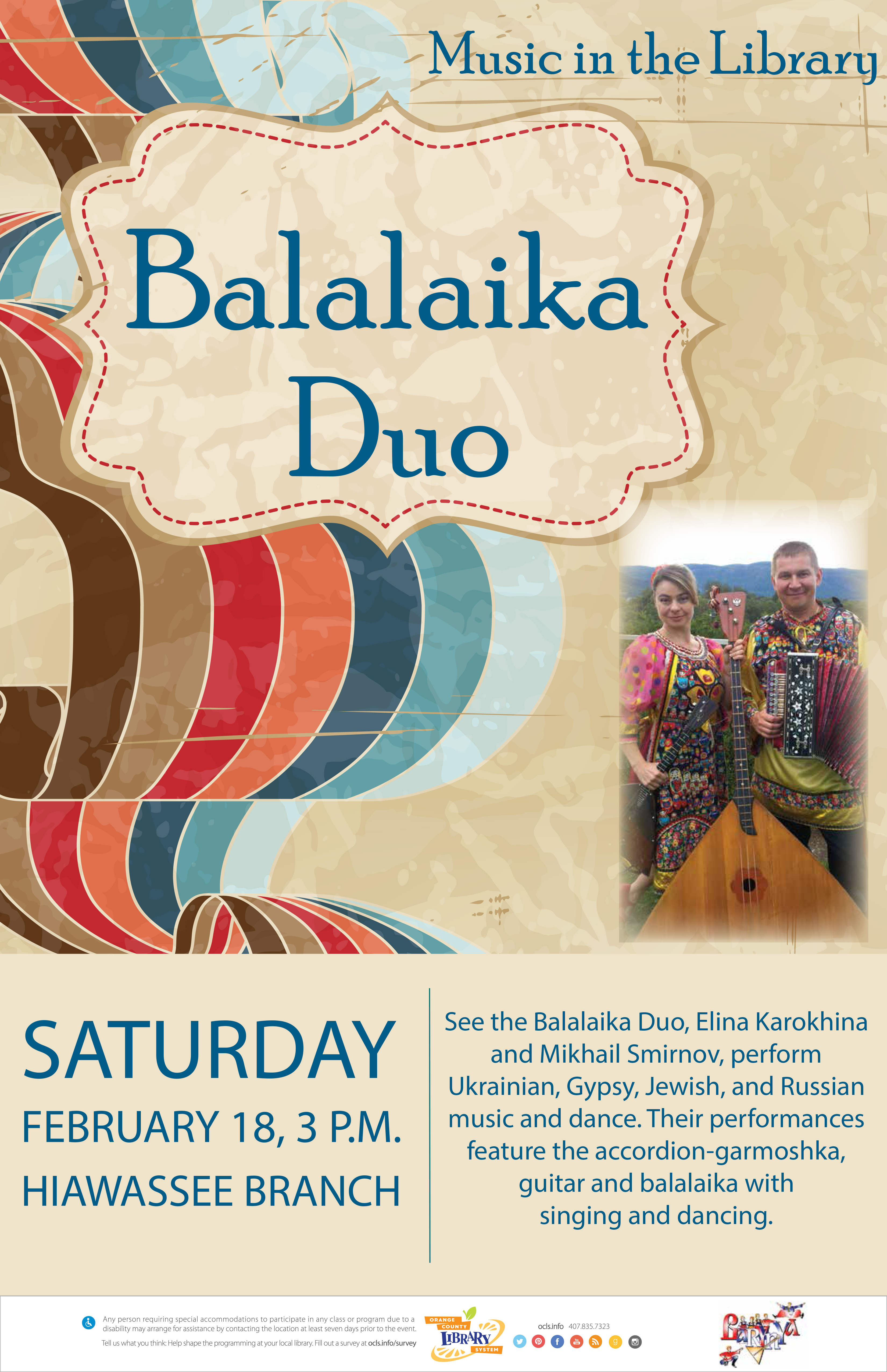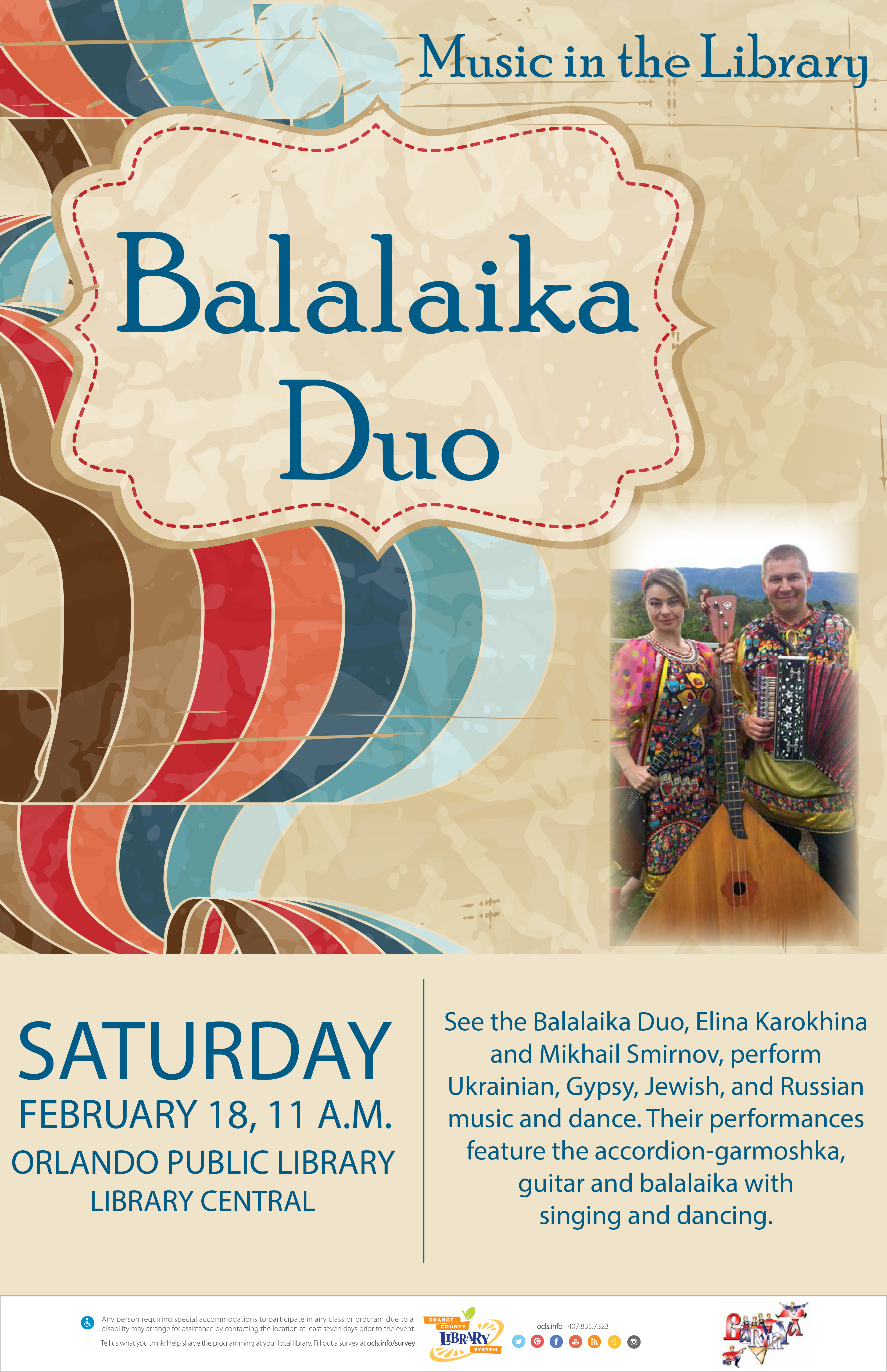 Russian Balalaika Duo, Mikhail Smirnov, Elina Karokhina, Orlando, Florida, February 2017, Orlando Public Library click the image above to see full-size high resolution poster