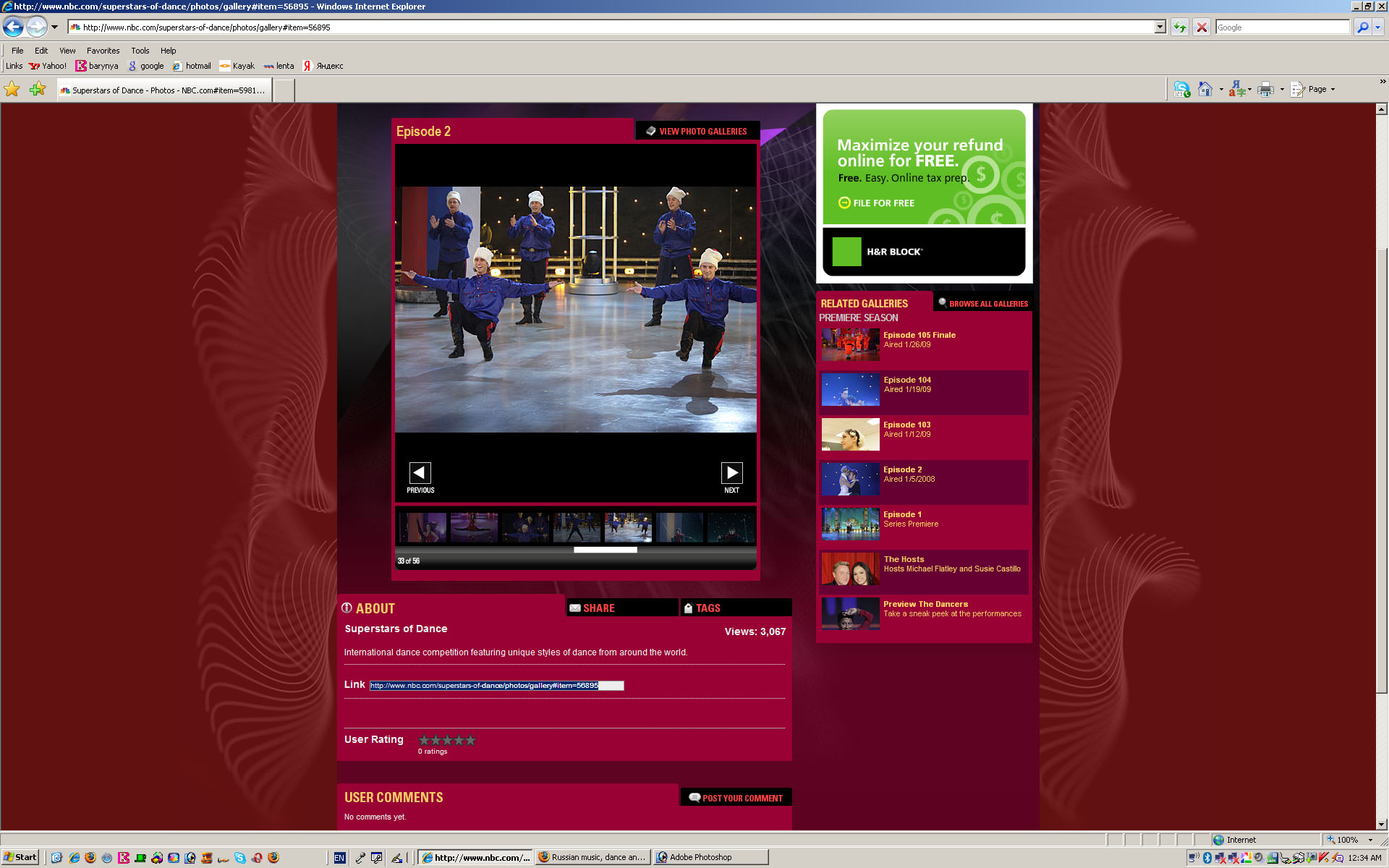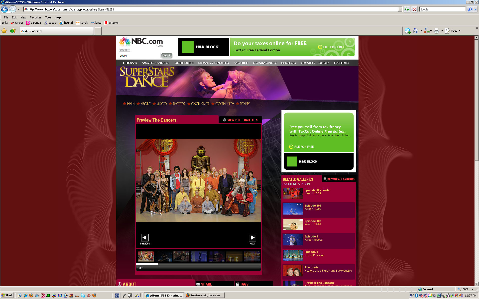 Выступление ансамбля Барыня на международном танцевальном конкурсе "СУПЕРСТАРС ОФ ДЭНС", съёмки национального американского канала эН-Би-Си, январь 2009 года. Танцовщики: Алексей Мальцев, Данила Шерстобитов, Александр Рудой, Василий Мышлецов, Ярослав Добрянский, Александр Сизов, Илья Стрельцов и Алексей Ключников. Хореография Виталий Вертерич, костюмы Светлана Гаврилова.