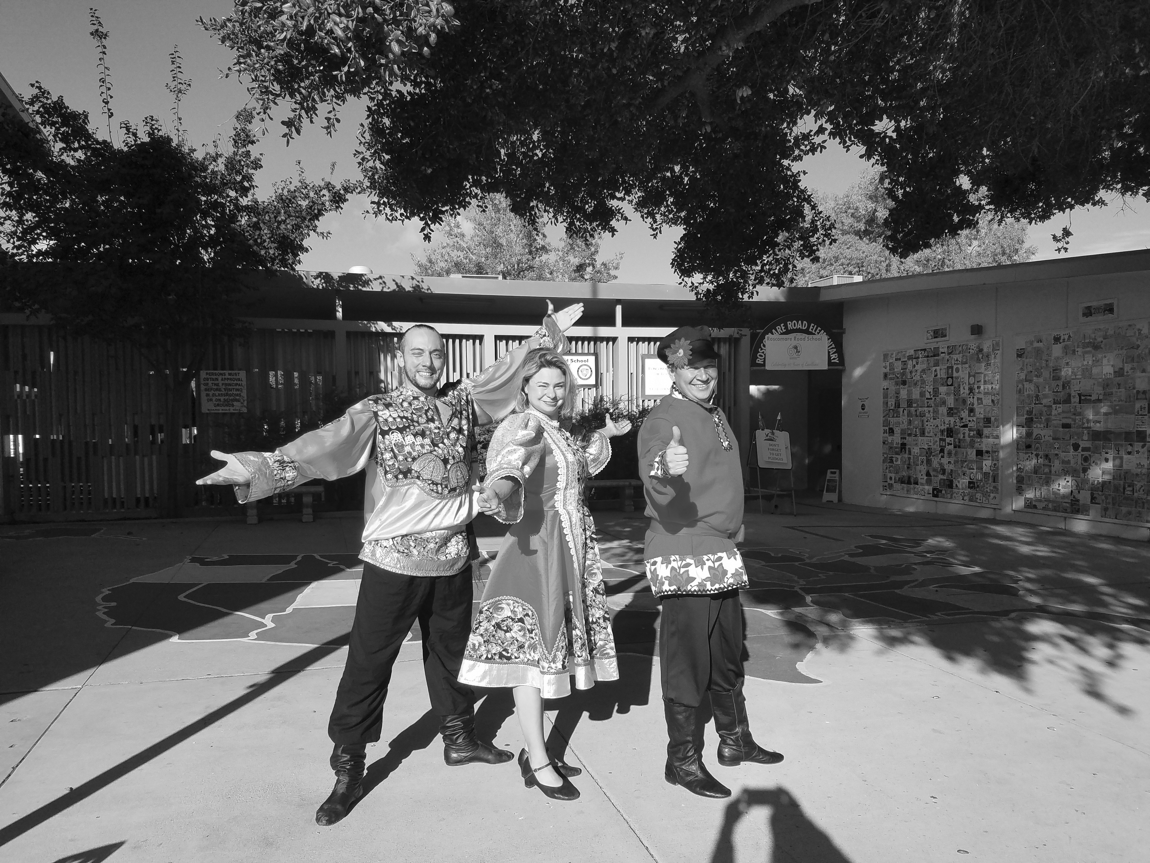 Russian dance, song and music trio Barynya performed two 45 min school assembly performances in Los Angeles, California. Both programs took place at the Roscomare Road Elementary School, 2425 Roscomare Rd, Los Angeles, CA 90077 on Friday, November 3rd, 2017, 8:30AM and 9:30AM. Cast of Barynya Trio included Ukrainian-Cossack dancer Serhiy Tsyganok, balalaika virtuoso Elina Karokhina, and garmoshka/guitar player/singer Mikhail Smirnov.