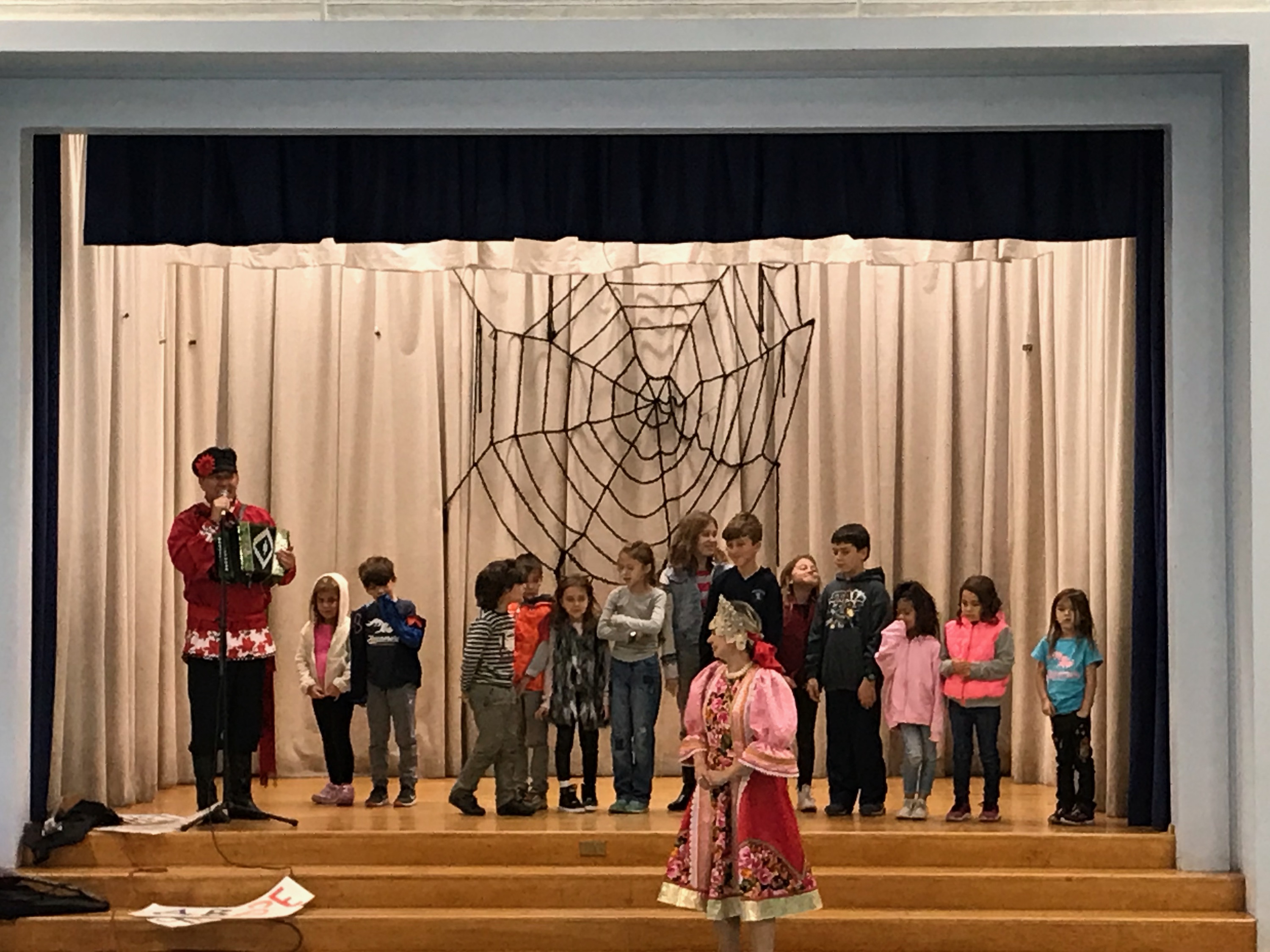 Artistic director/founder Mikhail Smirnov played the garmoshka, a Russian-style diatonic button accordion and guitar. In between numbers of the show Mikhail Smirnov shared a little bit of the Russian language with the students. He taught them phrases such as "Thank You" (SPASEEBA), "Hello" (ZDRASTVUITE), "You're Welcome" (PAZHALUYSTA) and "Bye" (PAKA) as well as the alphabet and counting. He said each word in English and then slowly in Russian, allowing the children a moment to try the words themselves after each one. After the segment on words, the students attempted to chatter in Russian for a couple minutes, smiling and laughing about how they sounded. Almost in the end of the performance, Mikhail paused to share a couple of Russian tongue twisters, explaining each one in English first, and then saying them in Russian at top speed. With each one, the twisters got more complicated and lengthy. There was even a chance for a handful of students to get up on stage and try out moves of Russian dance BARYNYA.