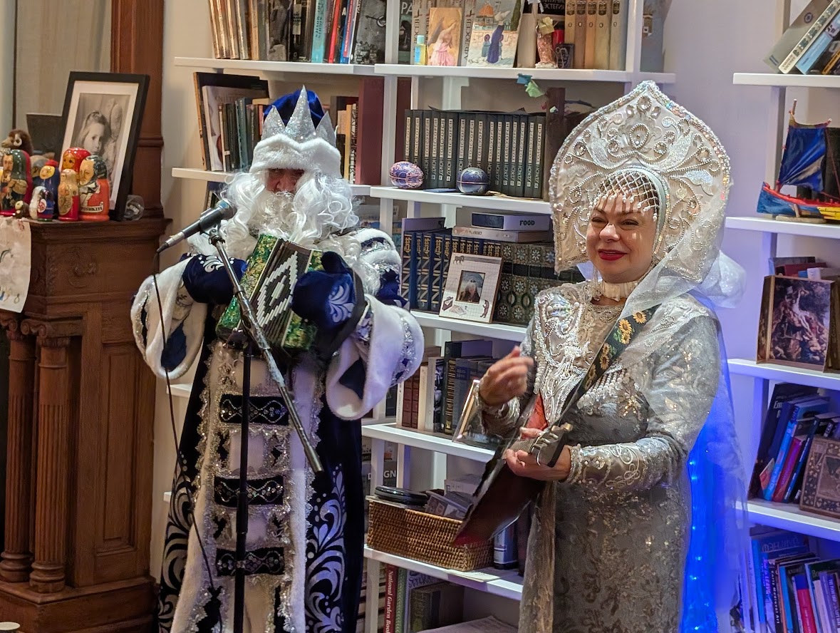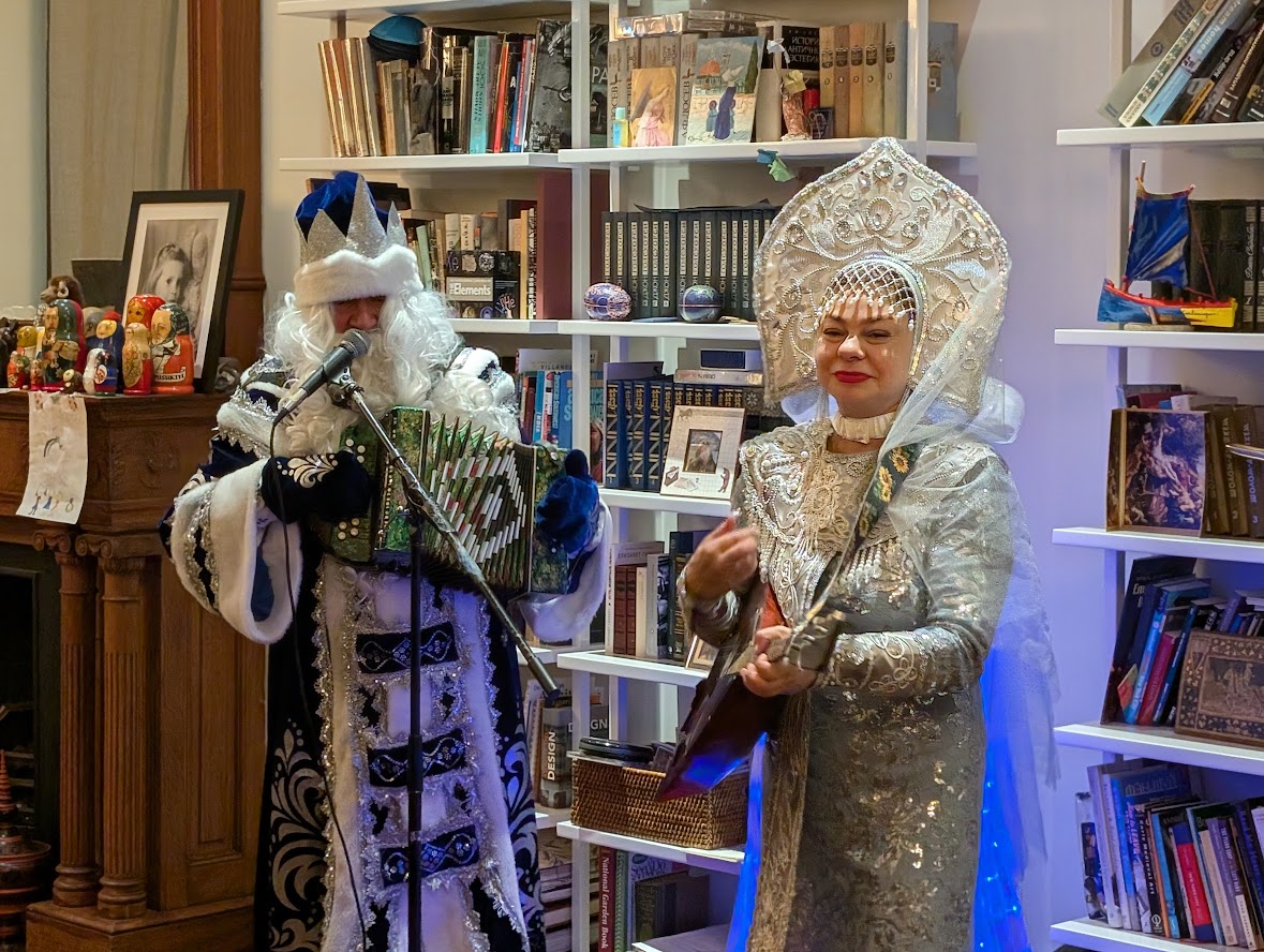 Ded Moroz (garmoshka) and Snegurochka (balalaika) performing popular Russian song "Вдруг как в сказке скрипнула дверь" during Old Russian New Year's Celebration in New York City