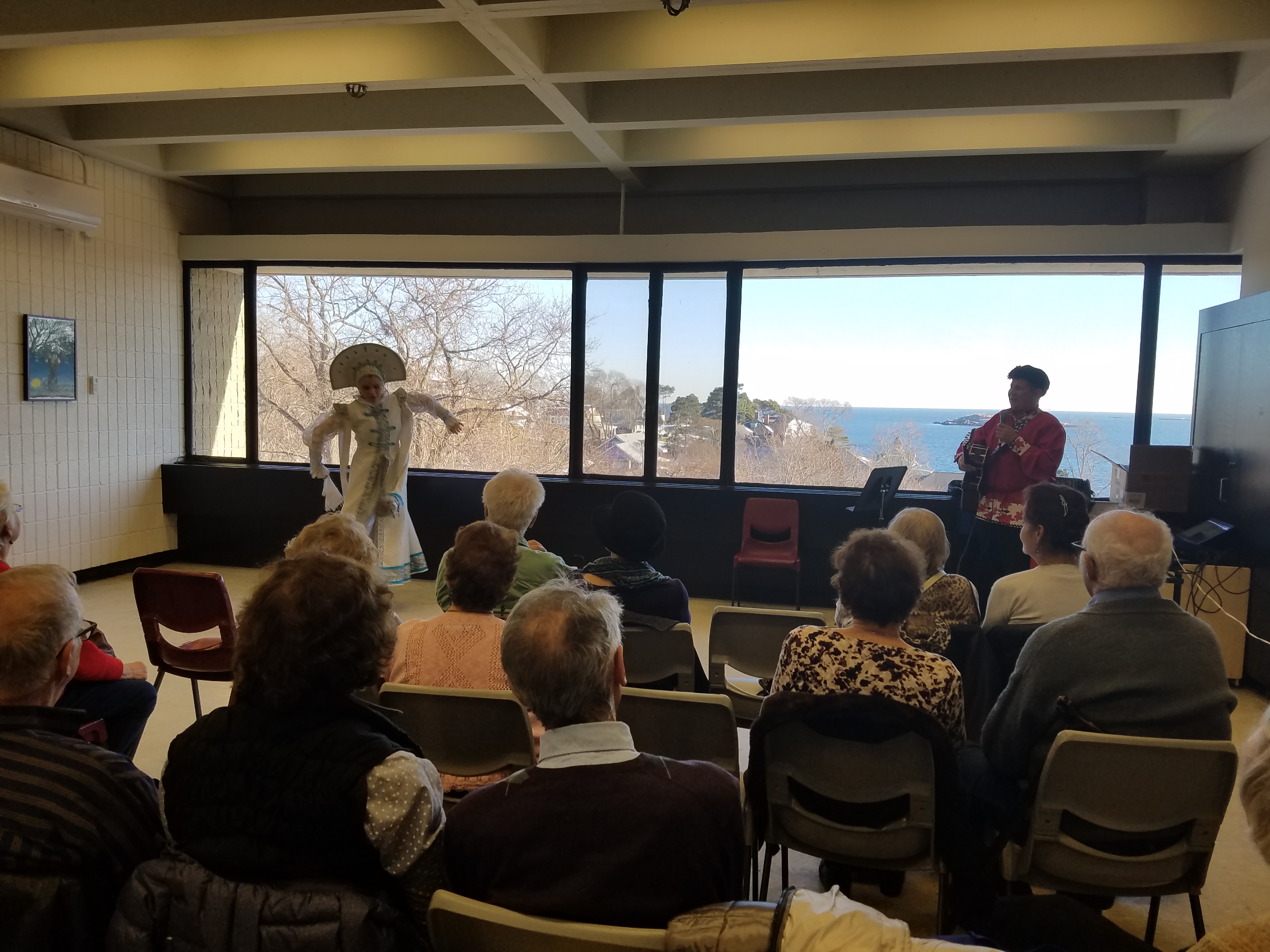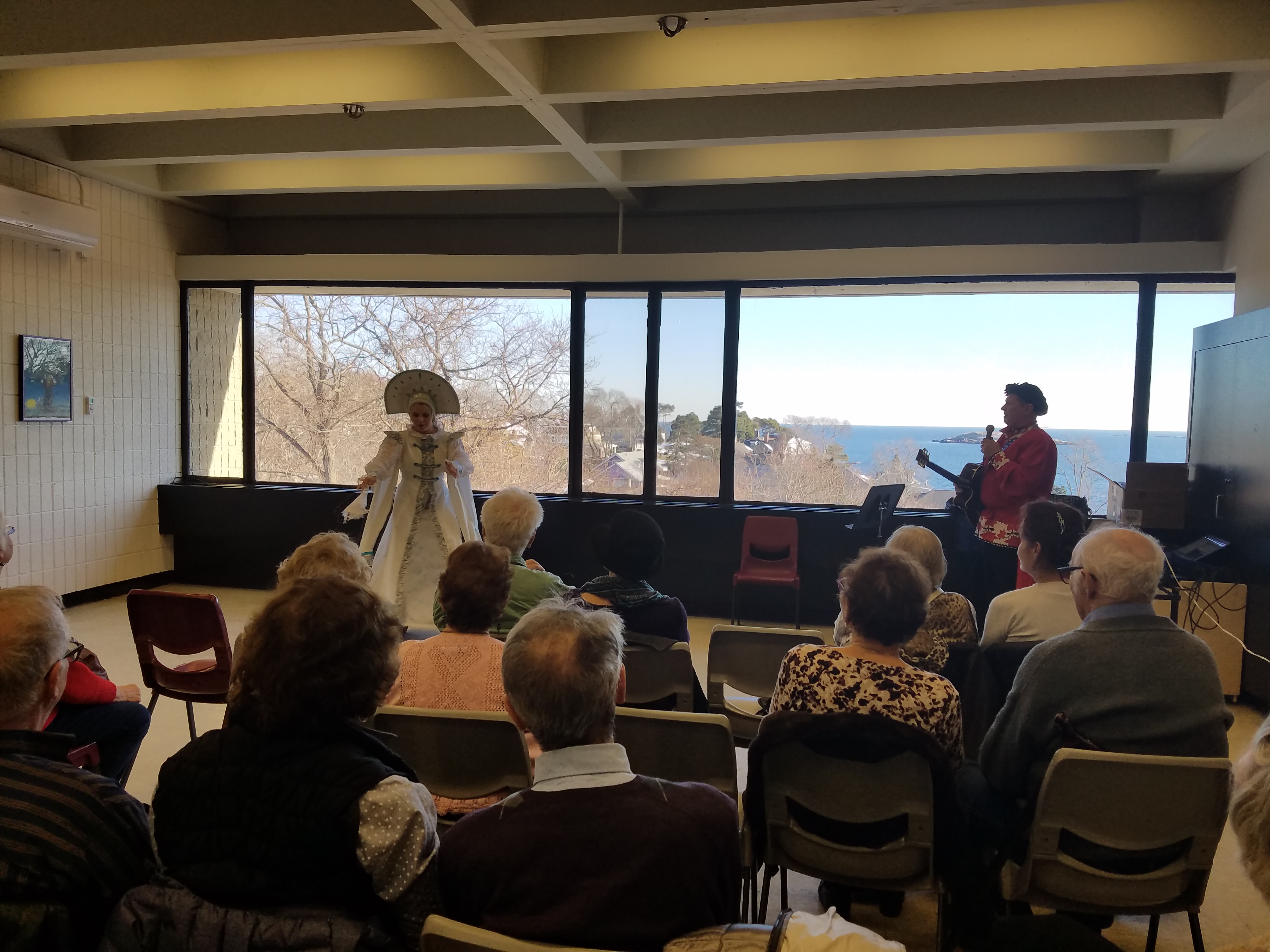 Russian Trio Barynya provided 45 min programs of traditional Jewish, Russian, Gypsy and Ukrainian dances, songs and music at the Marblehead's Jewish Community Center located at 4 Community Road, Marblehead, MA 01945. The audience was elder adults, Holocaust survivors, mostly from former USSR and Europe. The program of performances included Russian folk button accordion garmoshka introduction with popular folk song "Moroz" (Ой, мороз-мороз), Russian folk song and dance "The Snowstorm" (Russian: Метелица - Metelitsa), introduction of Russian folk instrument balalaika with performance of Russian folk dance "Kamarinskaiya" (Камаринская), Russian Gypsy Roma song and dance "Dark Eyes" (Очи Чёрные), "Skorogovorkee" - Medley of Russian tongue-twisters (Скороговорки), "Evreiskiy Tanets" - Russian Jewish wedding dance with Candle (Еврейский танец со свечкой), Ukrainian folk song and dance "You Tricked Me" (Пидманула), Instrumental Balalaika Medley of two Russian folk songs "Muzh" and "Valenkee" ("Как заставил меня муж", "Валенки"), Popular Russian folk song "Kaleenka" (Калинка-малинка моя), and other selections.