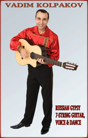 Vadim Kolpakov is one of the most prominent and renowned Russian Roma (Gypsy) guitarists in the world. Hailing from Saratov, Russia, Vadim graduated from the Roma performing arts school Gilori and studied guitar with his uncle Alexander Kolpakov, the legendary Russian-Gypsy guitarist and composer. At the age of 15, Vadim began work at the Romen Gypsy Theatre in Moscow, where he worked for 8 years and was the leading guitarist for 7 years.