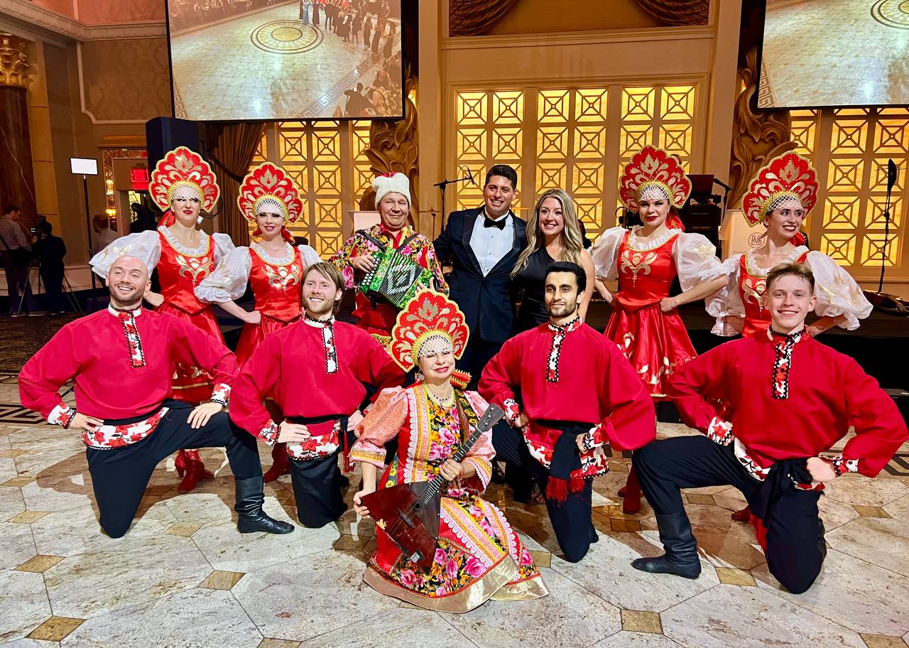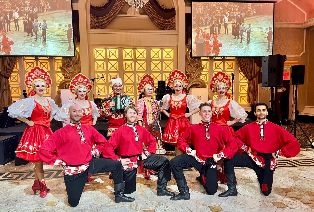 Russian dance and music ensemble Barynya (8 dancers, 2 musicians) performed during wedding reception in New Jersey on February 15th, 2026. Venue: The Venetian (Palazzo Ballroom), 546 River Dr, Garfield, NJ 07026. Musicians: Elina Karokhina (balalaika), Mikhail Smirnov (garmoshka, vocals, guitar). Dancers: Arsentii Oskin, Vladimir Nikitin, Ivan, Moshe, Maiija Rutkovka, Alisa Egorova, Tara Kuhl, Lisa Shevelchinski.