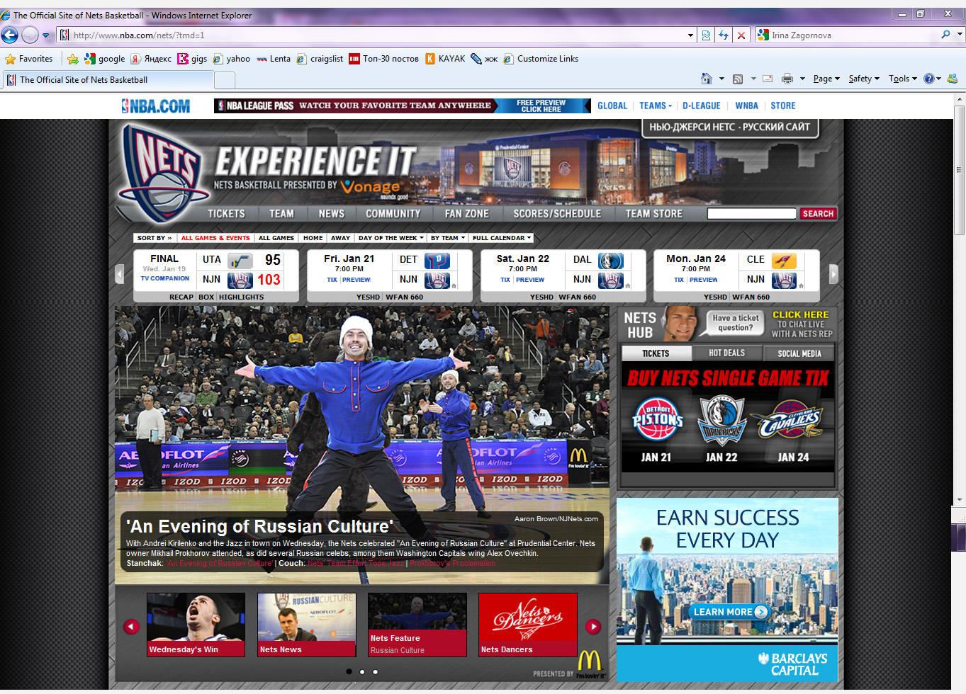 On Wednesday, June 27th, 2007 from 7:30pm to 11:00pm dancers of Russian dance and music ensemble Barynya and NYC Danchenko's Gypsy Show provided several performances during Russian Heritage Festival Spirits of Russia at the popular Club Copacabana in New York City. Exact address of the venue: Copacabana, 560 W. 34th St., Manhattan, NY 10019-1001. Cast of ensemble Barynya dancers: Ilia Pankratov, Mikhail Nesterenko, Vitaliy Verterich, Ganna Makarova, Olga Chpitalnaia, Olga Verterich.
