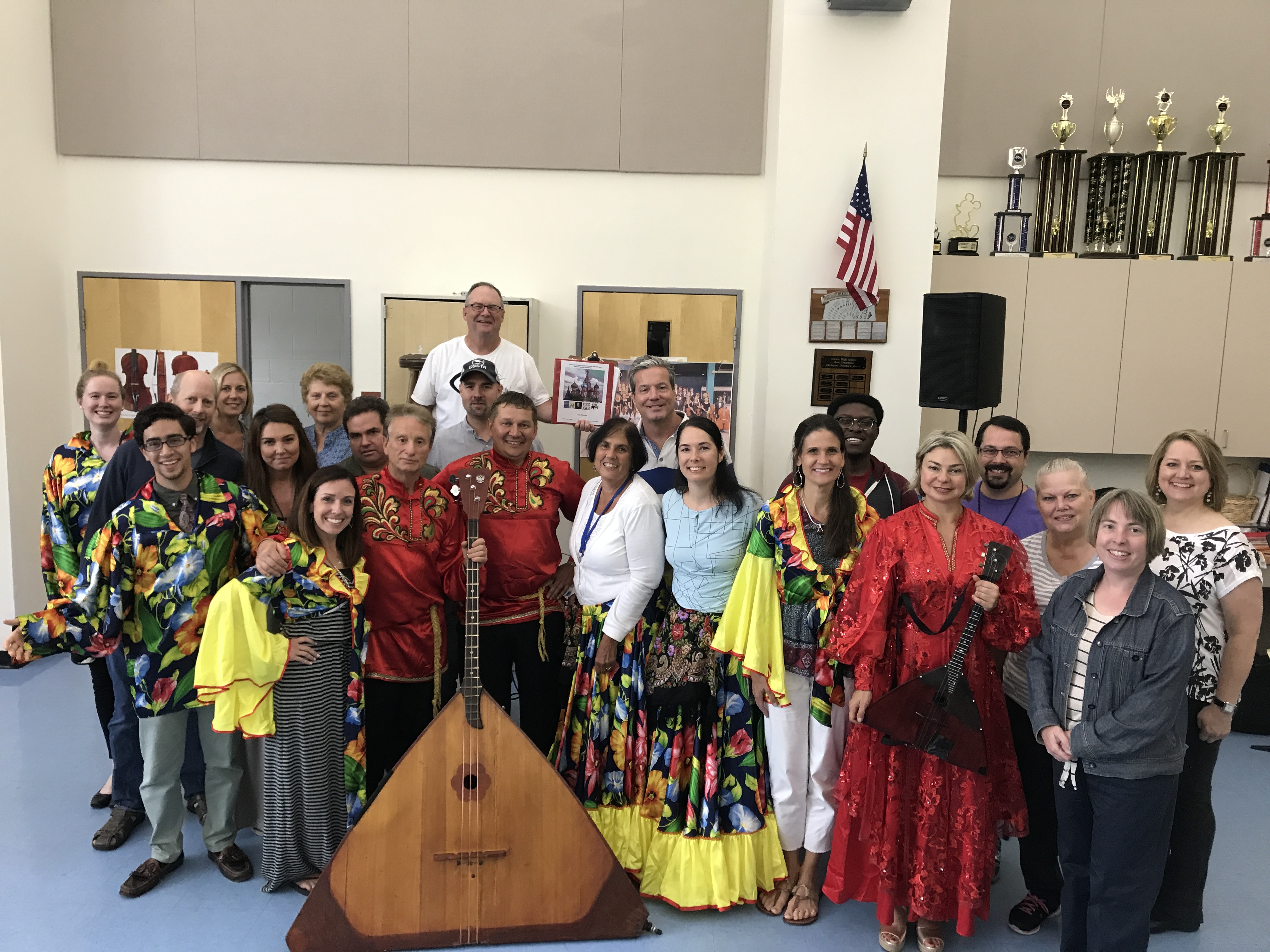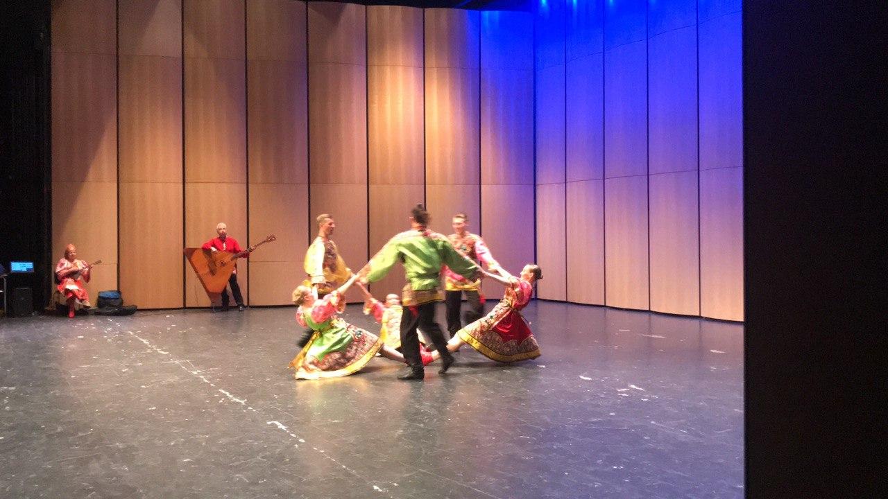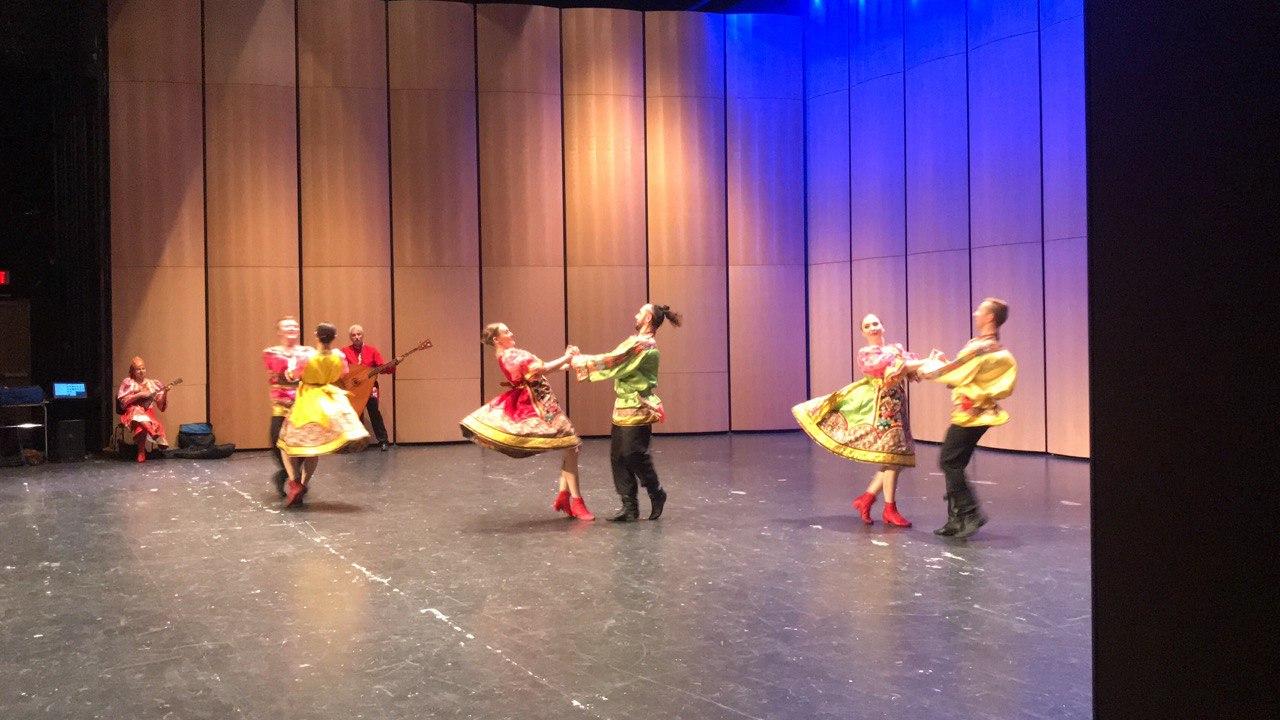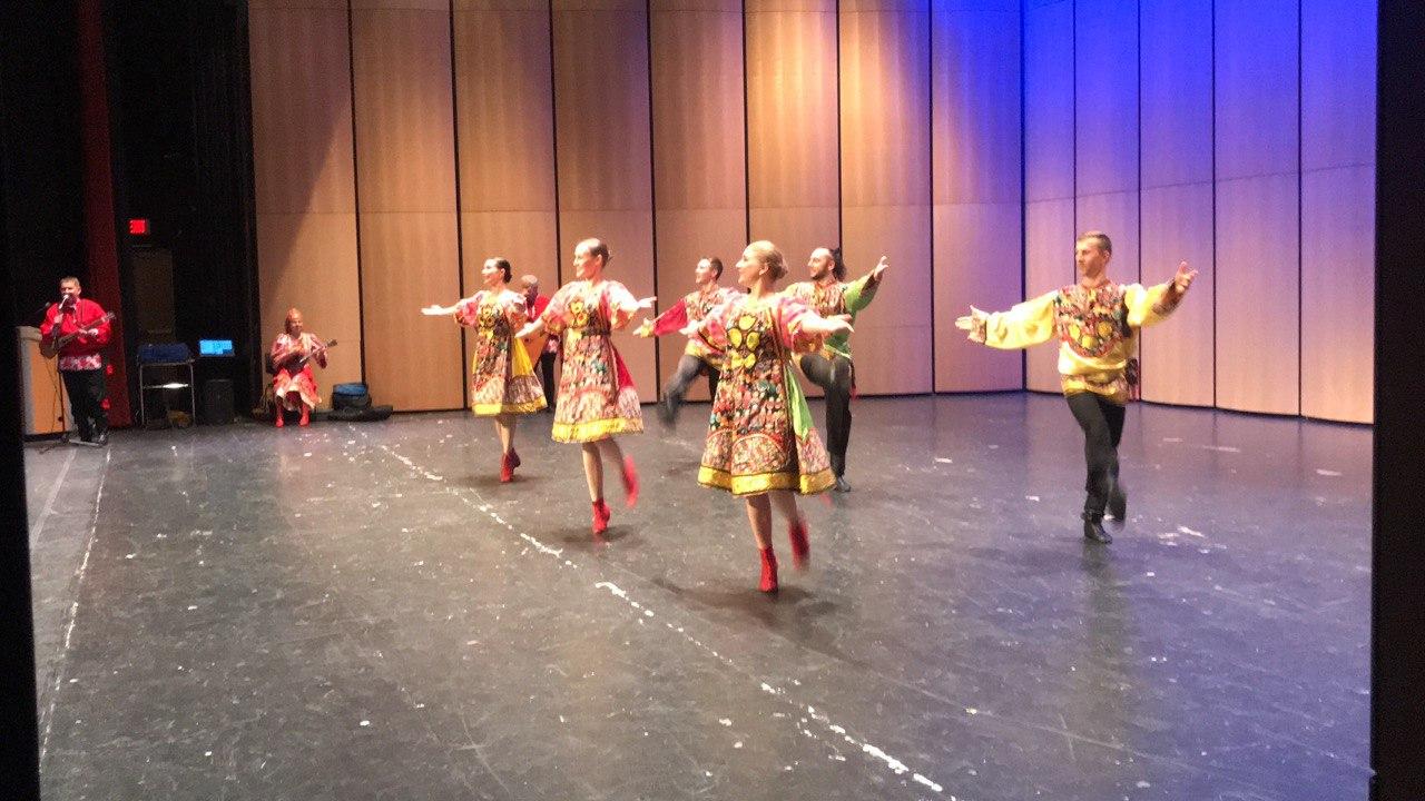 Russian music, dance and song ensemble "Barynya" provided Russian folk song and dance workshop and formal 90 min performance on Tuesday, April 17th 2018 at the Darien High School, 80 High School Lane, Darien CT 06820. Folk songs and dance master class with high school and middle school students started at 5pm. Performance started at 7pm. Cast of Barynya performers: Vladimir Nikitin, Konstantin Tulinov, Serhiy Tsyganok, Simona Zhukovski, Olga Chpitalnaia, Dinara Subaeva, Leonid Bruk, Alisa Egorova, Elina Karokhina, Mikhail Smirnov. Program of performance: Russian folk song and dance KALINKA (The Snowball Tree), Russian song and dance METELITSA (The Snowstorm), Sibirian Nanai dance (НАНАЕЦ), BARYNYA, PIDMANULA, KAMARINSKAIA, TATARSKIY, contrabass-balalaika solo, Jewish Candle dance, Andgry Husband (КАК ЗАСТАВИЛ МЕНЯ МУЖ), Jewish Bottle dance (БУТЫЛКИ), Peddlers (КОРОБУШКА), Cossack dance (КАЗАЧИЙ ТАНЕЦ ВАРЕНЬКА), Russian Tongue-Twisters (СКОРОГОВОРКИ), Sailors dance (ЯБЛОЧКО), Ukrainian National Dance "Hopak" (ГОПАК), Dark Eyes (ОЧИ ЧЕРНЫЕ), Russian Gypsy Romani dance Mardzhandzha (ЦЫГАНСКИЙ ТАНЕЦ МАРДЖАНДЖА), Waltz Durane (ДЮРАН), and other selections.