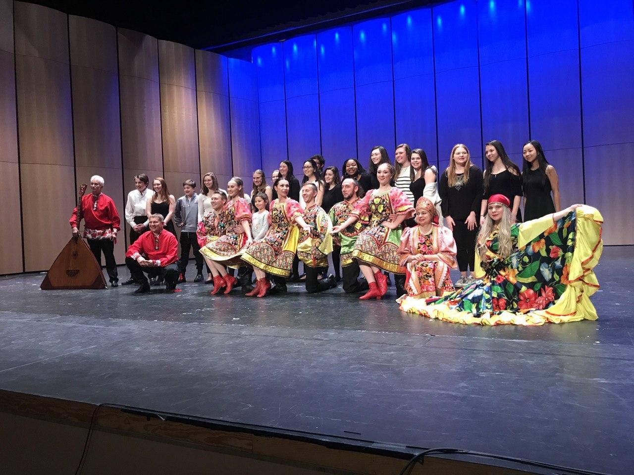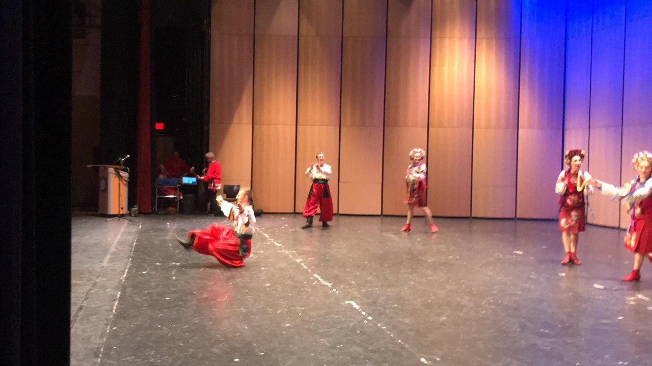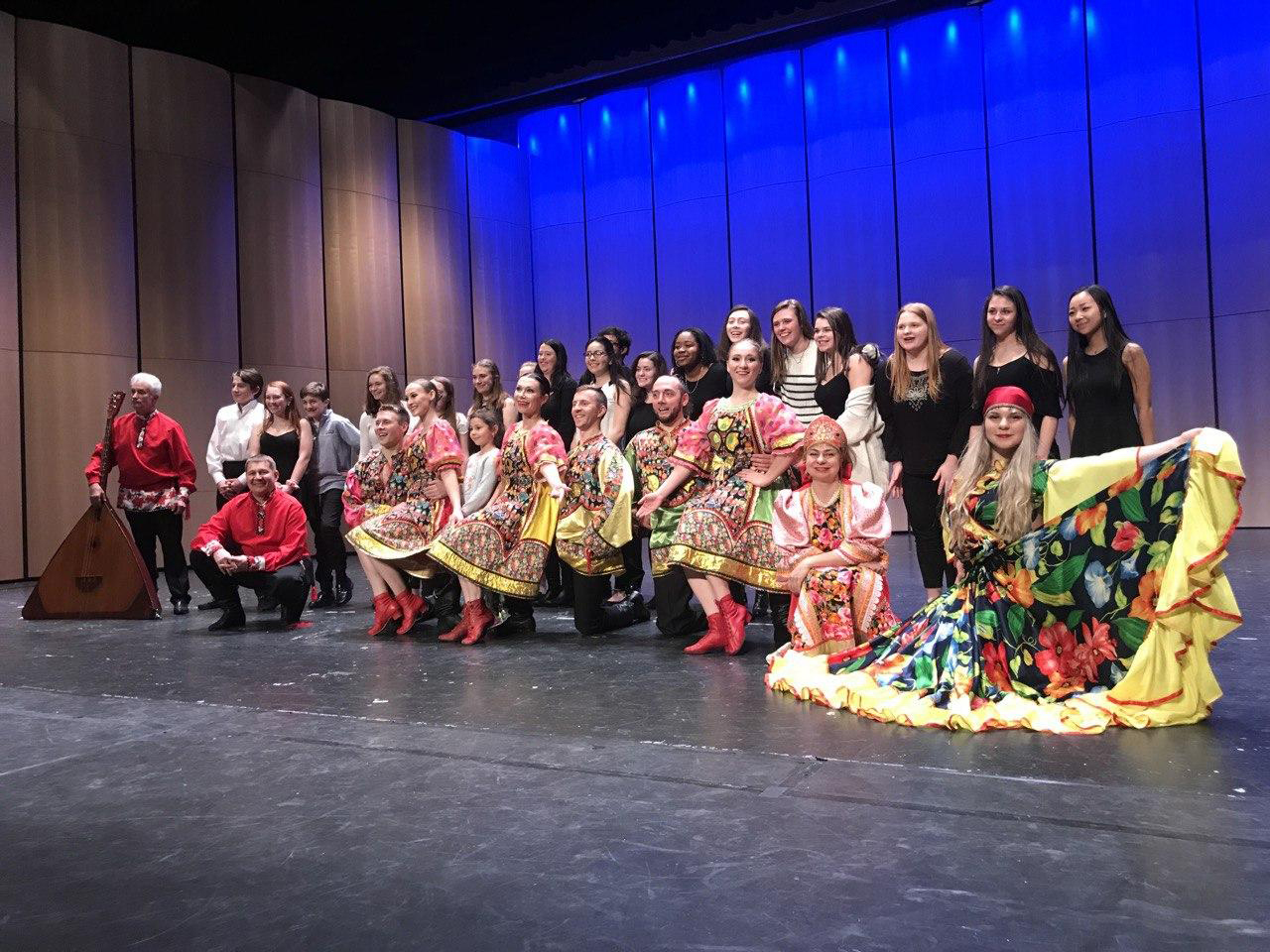 Russian music, dance and song ensemble "Barynya" provided Russian folk song and dance workshop and formal 90 min performance on Tuesday, April 17th 2018 at the Darien High School, 80 High School Lane, Darien CT 06820. Folk songs and dance master class with high school and middle school students started at 5pm. Performance started at 7pm. Cast of Barynya performers: Vladimir Nikitin, Konstantin Tulinov, Serhiy Tsyganok, Simona Zhukovski, Olga Chpitalnaia, Dinara Subaeva, Leonid Bruk, Alisa Egorova, Elina Karokhina, Mikhail Smirnov. Program of performance: Russian folk song and dance KALINKA (The Snowball Tree), Russian song and dance METELITSA (The Snowstorm), Sibirian Nanai dance (НАНАЕЦ), BARYNYA, PIDMANULA, KAMARINSKAIA, TATARSKIY, contrabass-balalaika solo, Jewish Candle dance, Andgry Husband (КАК ЗАСТАВИЛ МЕНЯ МУЖ), Jewish Bottle dance (БУТЫЛКИ), Peddlers (КОРОБУШКА), Cossack dance (КАЗАЧИЙ ТАНЕЦ ВАРЕНЬКА), Russian Tongue-Twisters (СКОРОГОВОРКИ), Sailors dance (ЯБЛОЧКО), Ukrainian National Dance "Hopak" (ГОПАК), Dark Eyes (ОЧИ ЧЕРНЫЕ), Russian Gypsy Romani dance Mardzhandzha (ЦЫГАНСКИЙ ТАНЕЦ МАРДЖАНДЖА), Waltz Durane (ДЮРАН), and other selections.