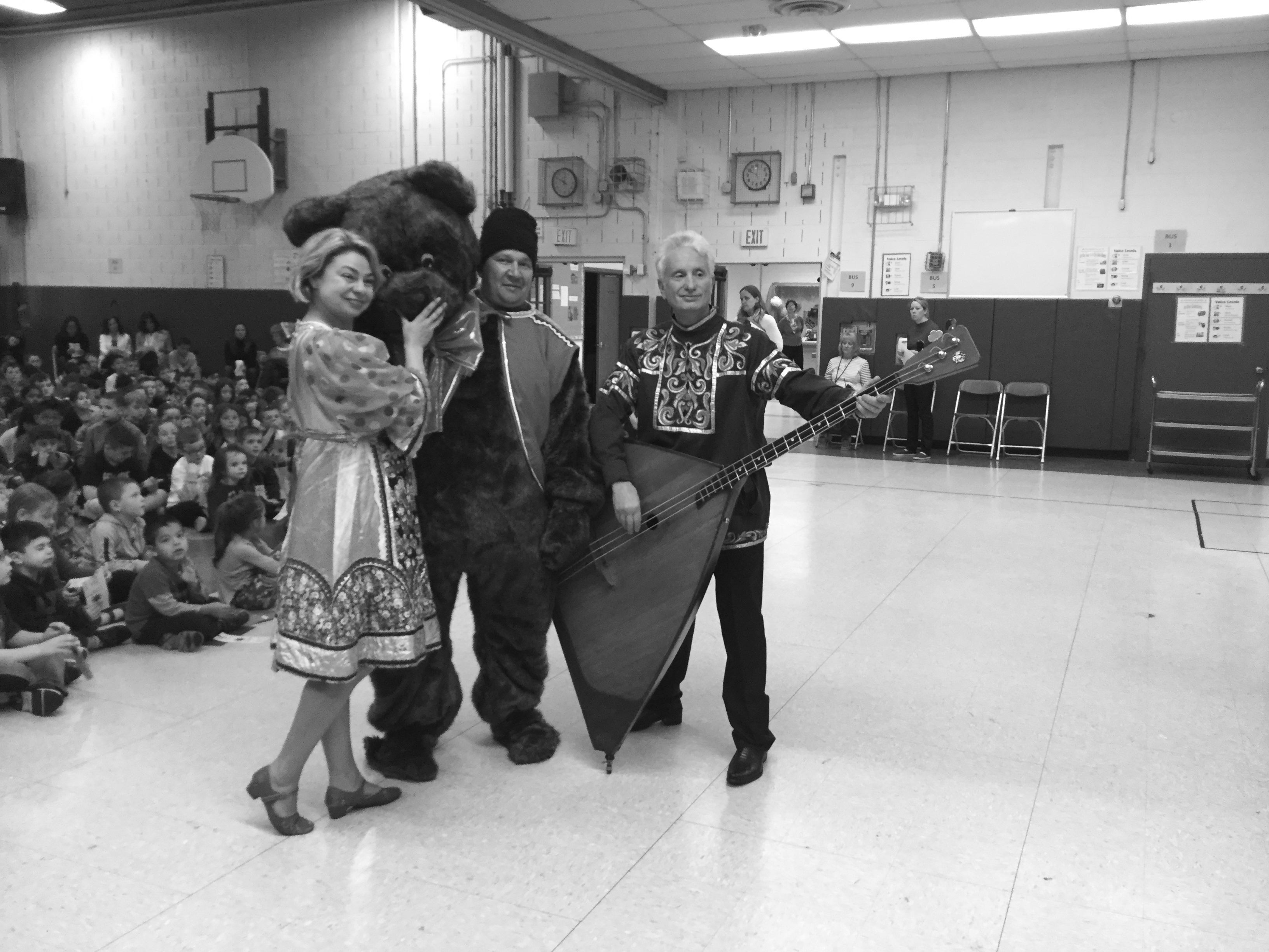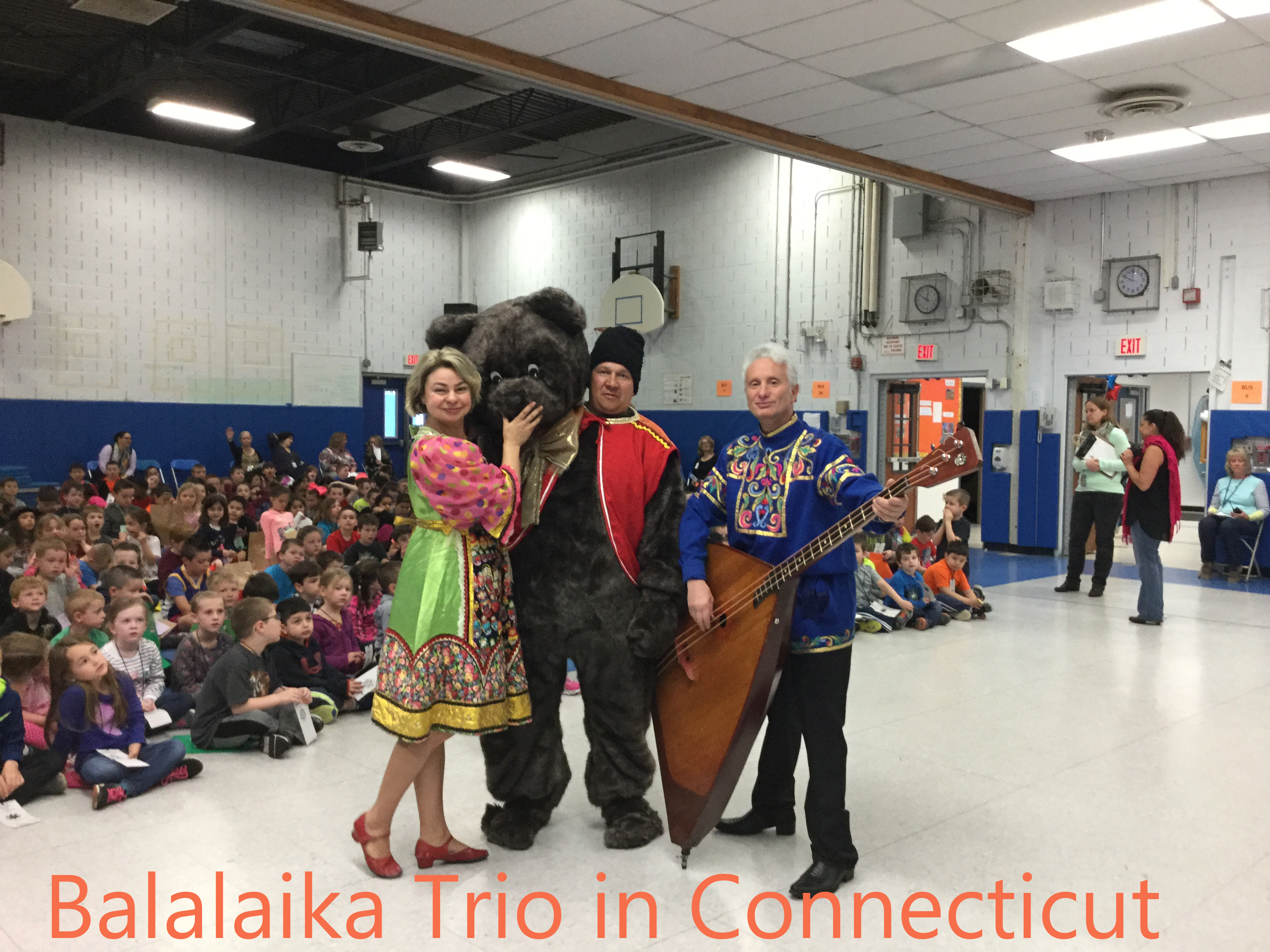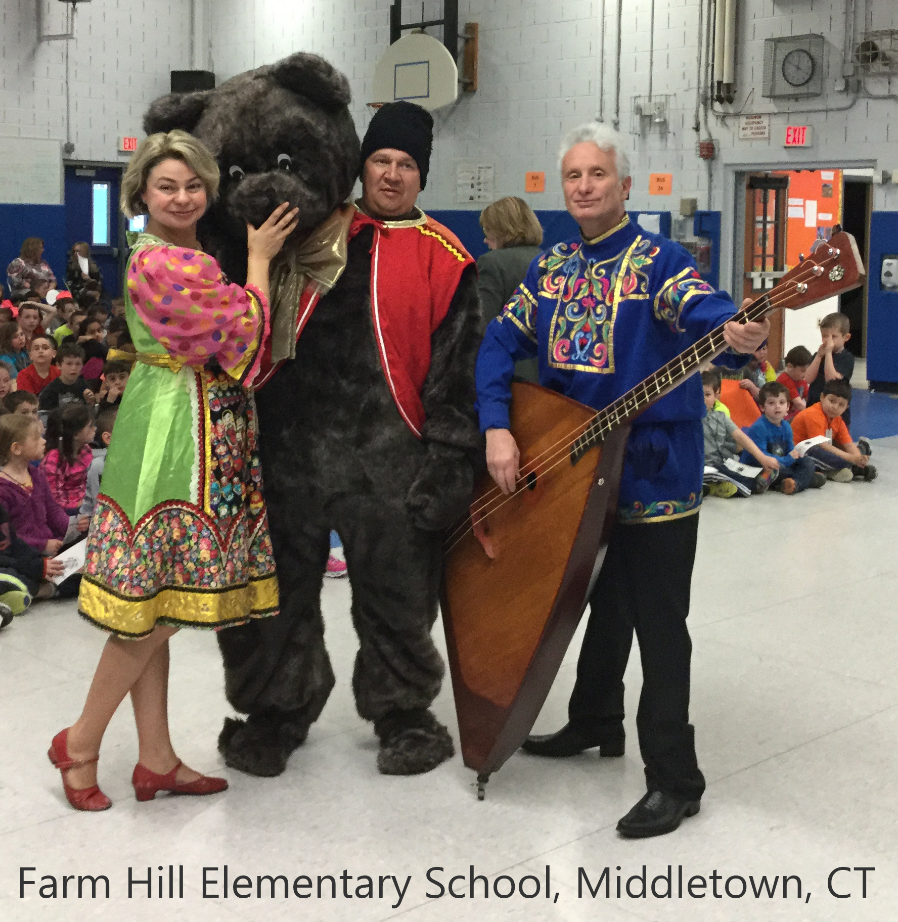 Russian music, dance and song balalaika trio (Leonid Bruk, Elina Karokhina, Mikhail Smirnov) performed three small concerts in Middletown, Connecticut in the spring 2016. First concert and workshop took place at the World Music Hall of Wesleyan University. Second show was a 45 min concert for students and teachers at the Farm Hill Elementary School located at 390 E Ridge Rd, Middletown, CT 06457 on Monday, May 2nd. 2016. School assembly performance started at 2PM. The Balalaika Trio performed Siberian Nanai Wrestling Dance "Нанаец", Russian folk button accordion "Гармошка" introduction with traditional Russian song "Kalinka", The Snowstorm, Russian folk dance ("Метелица"), Kamarinskaiya, Russian folk instrument balalaika introduction ("Камаринская"),