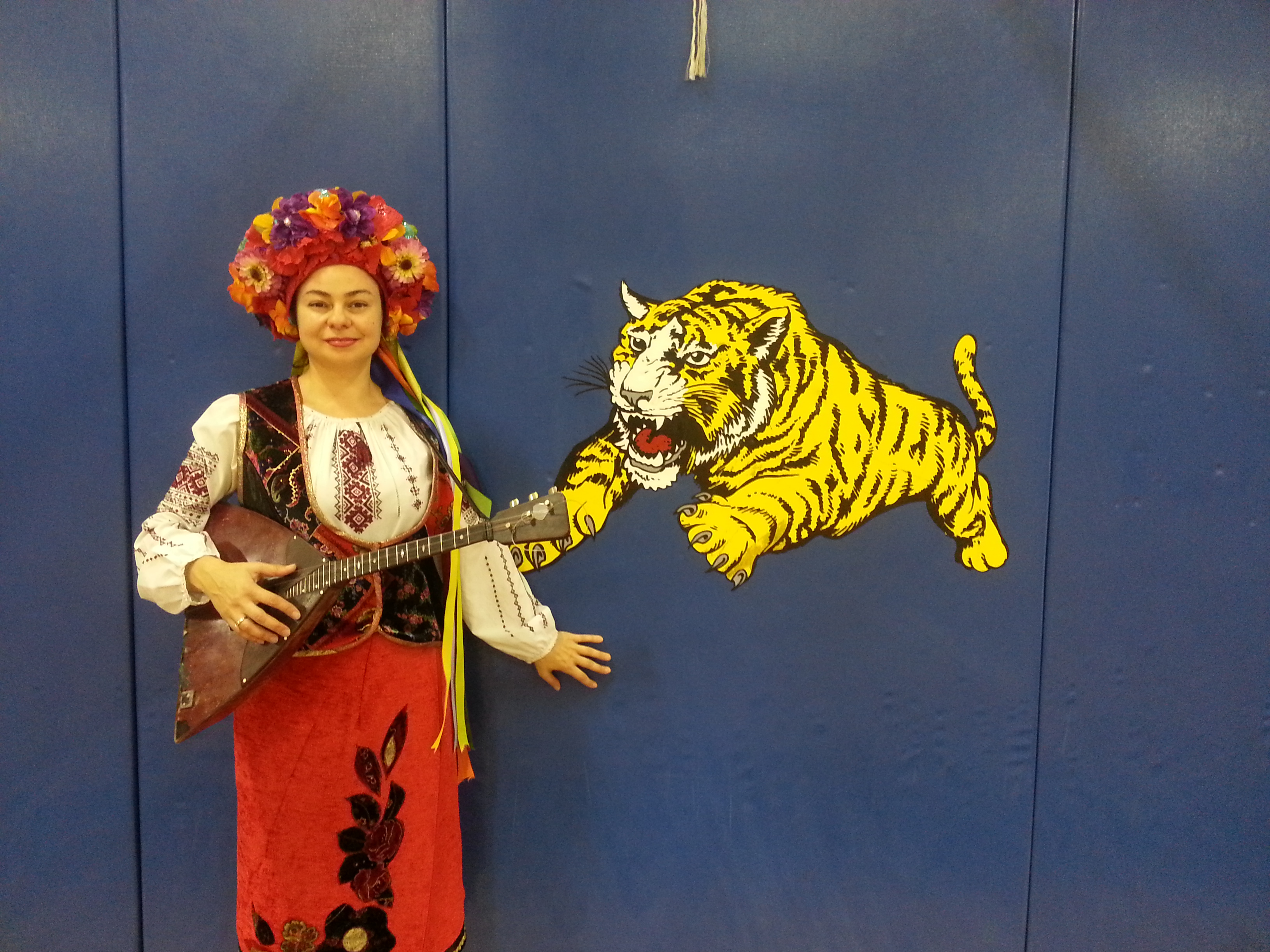 Musical director of the group Elina Karokhina played the balalaika, a three-stringed, triangular instrument, performed Russian folk dance "Metelitsa" (The Snowstorm), Russian Gypsy Roma dance "Dark Eyes", and Ukrainian traditional dance "Pidmanula" (You Tricked Me).