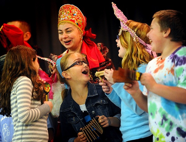 DYLAN SLAGLE/STAFF PHOTO. Playing Russian instruments. Third-graders, from left, Kaecee Ledden, Raven McMichael, fourth-grader Julia Patch and third-grader R.J. Hooper react as performer Elina Karokhina gives them Russian-styled hats and folk instruments during a "Russian Spectacular" performance by Barynya, a professional dancing and singing group, at Sandymount Elementary School Thursday.