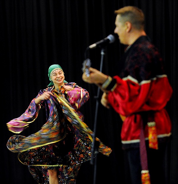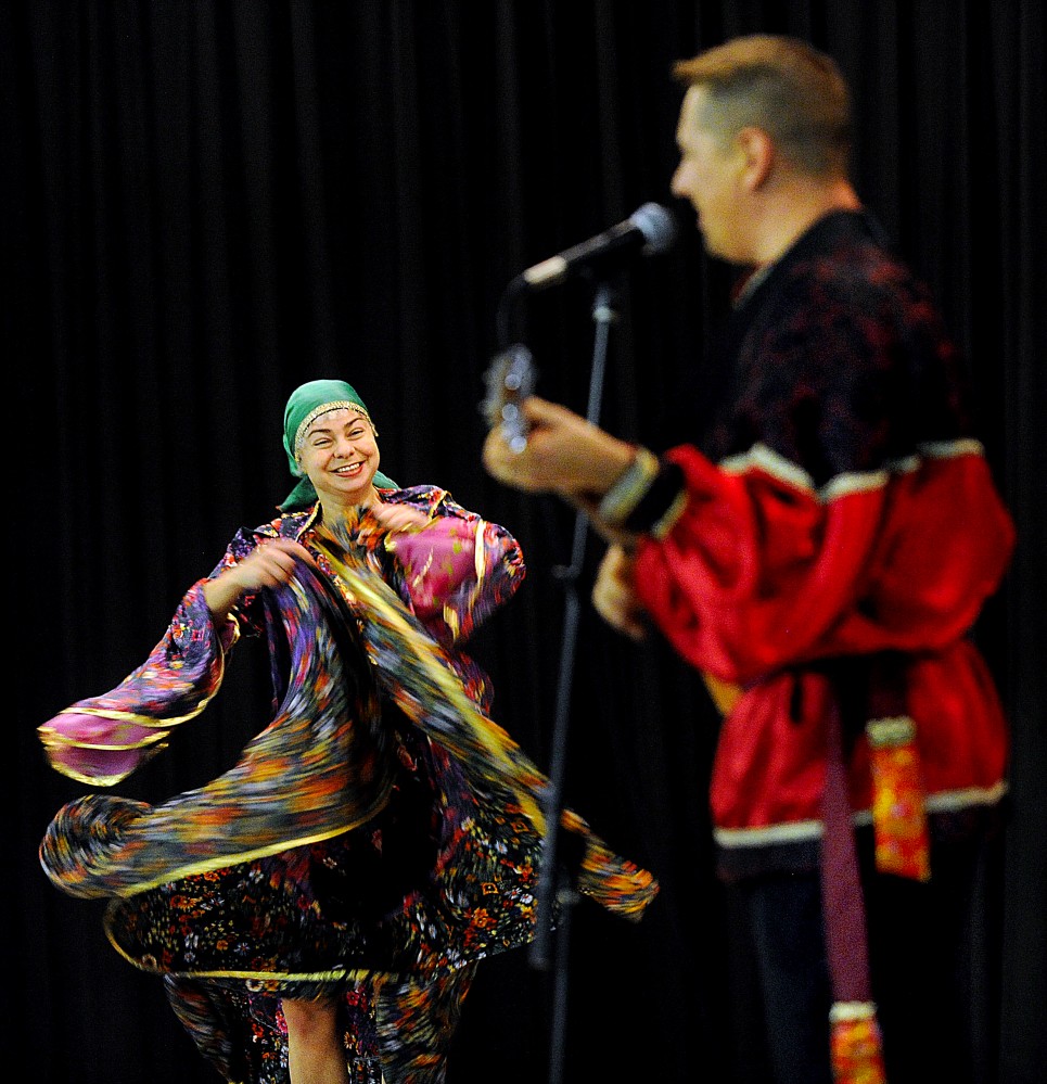 The group is made up of about 25 people, but only three are on this tour; they always have someone to dance, sing and play instruments. This time around, Smirnov plays the garmoshka, a Russian-style accordion; Elina Karokhina plays the balalaika, a three-stringed, triangular instrument; and Alisa Yegorova dances.