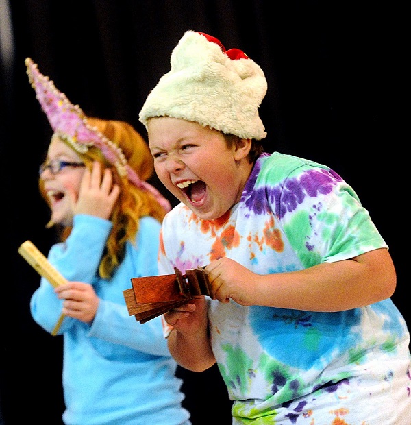 DYLAN SLAGLE/STAFF PHOTO. Playing Russian instruments. Third-grader R.J. Hooper, right, and fourth-grader Julia Patch, left, play Russian folk instruments after being invited on stage during a “Russian Spectacular” performance by Barynya, a professional dancing and singing group, at Sandymount Elementary School Thursday.