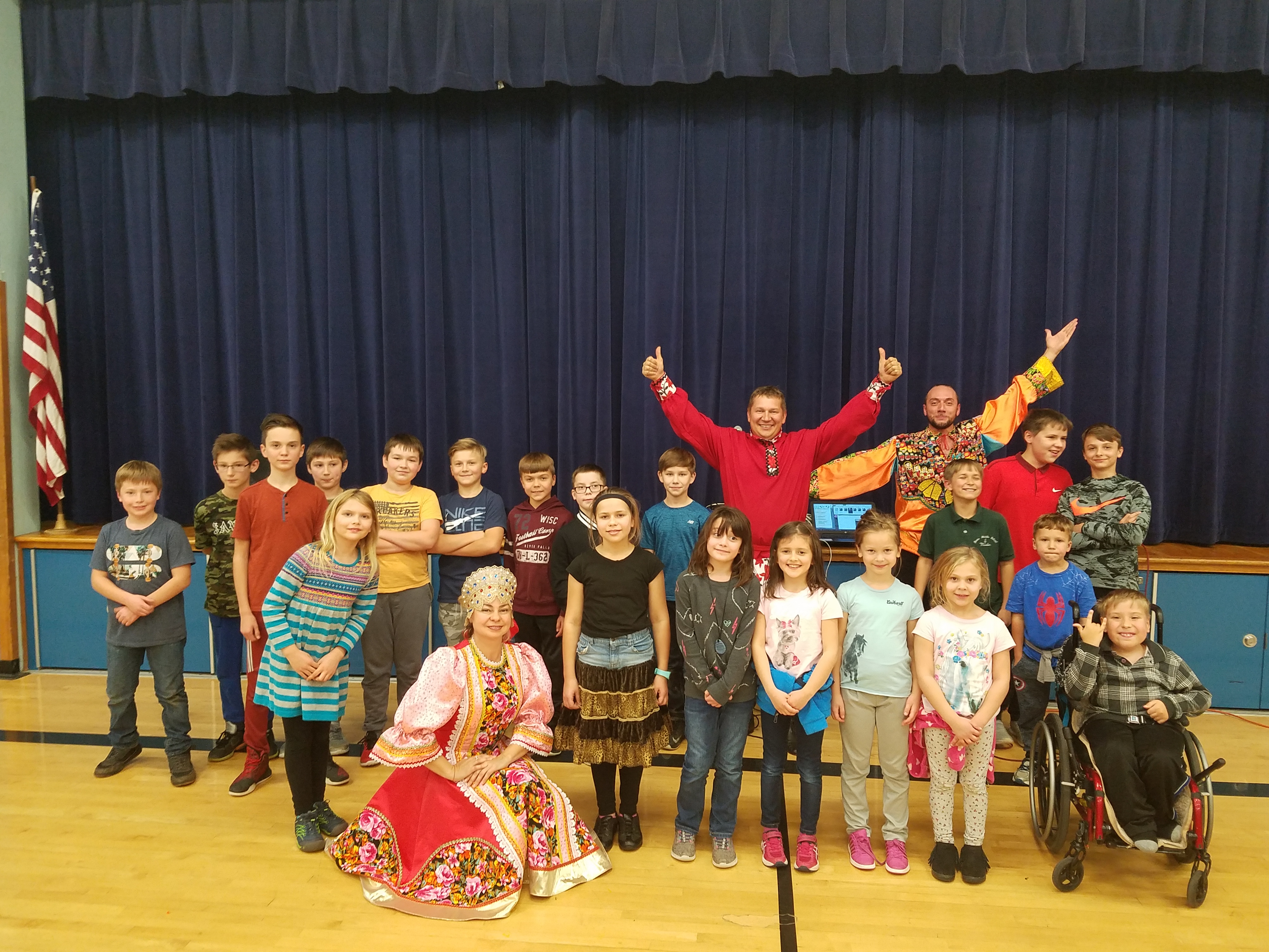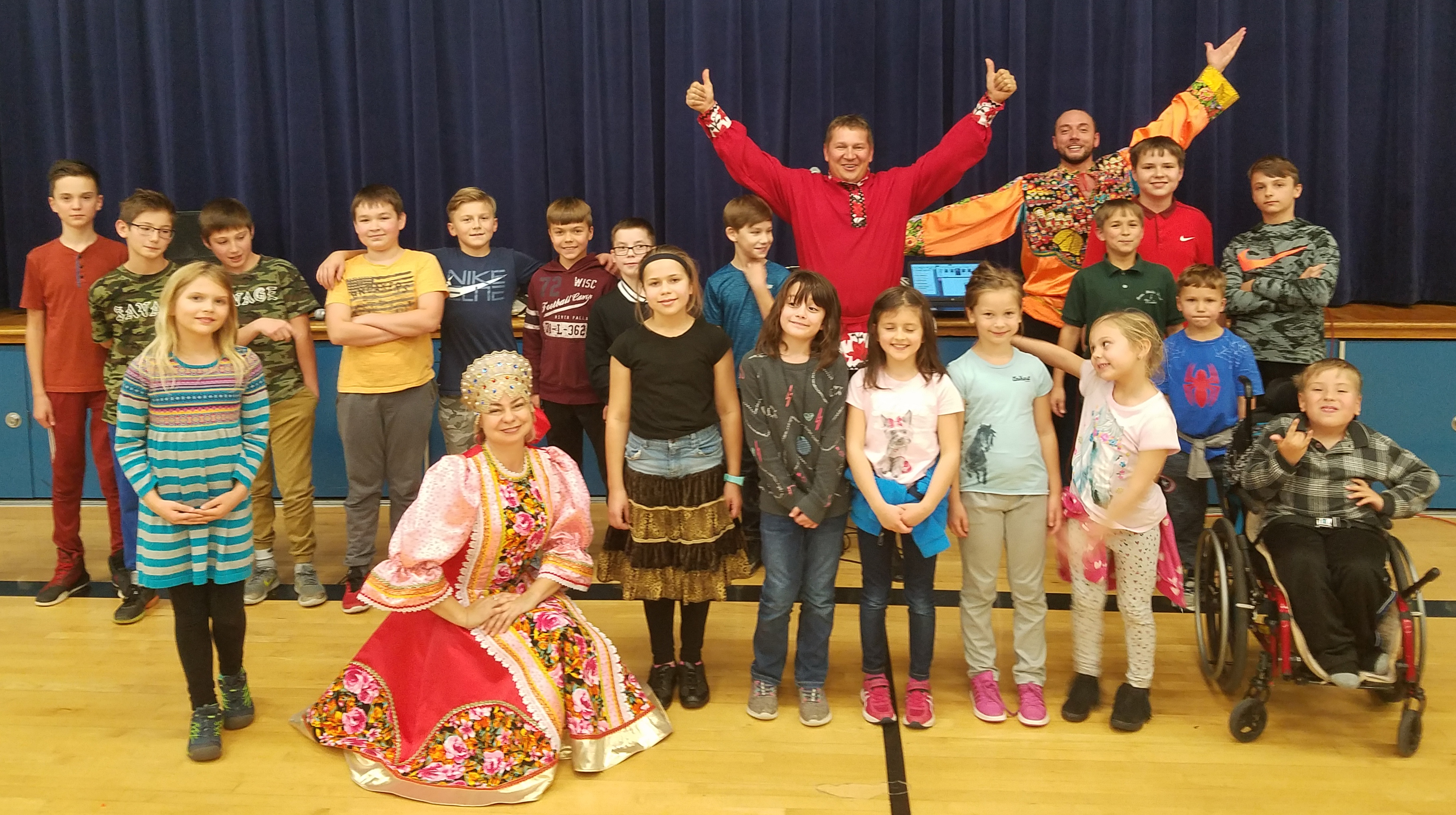 Deep Creek Damascus K8 School, Damascus, Oregon. Dancer Serhiy Tsyganok, Balalaika virtuoso Elina Karokhina, and Mikhail Smirnov with Russian-speaking students