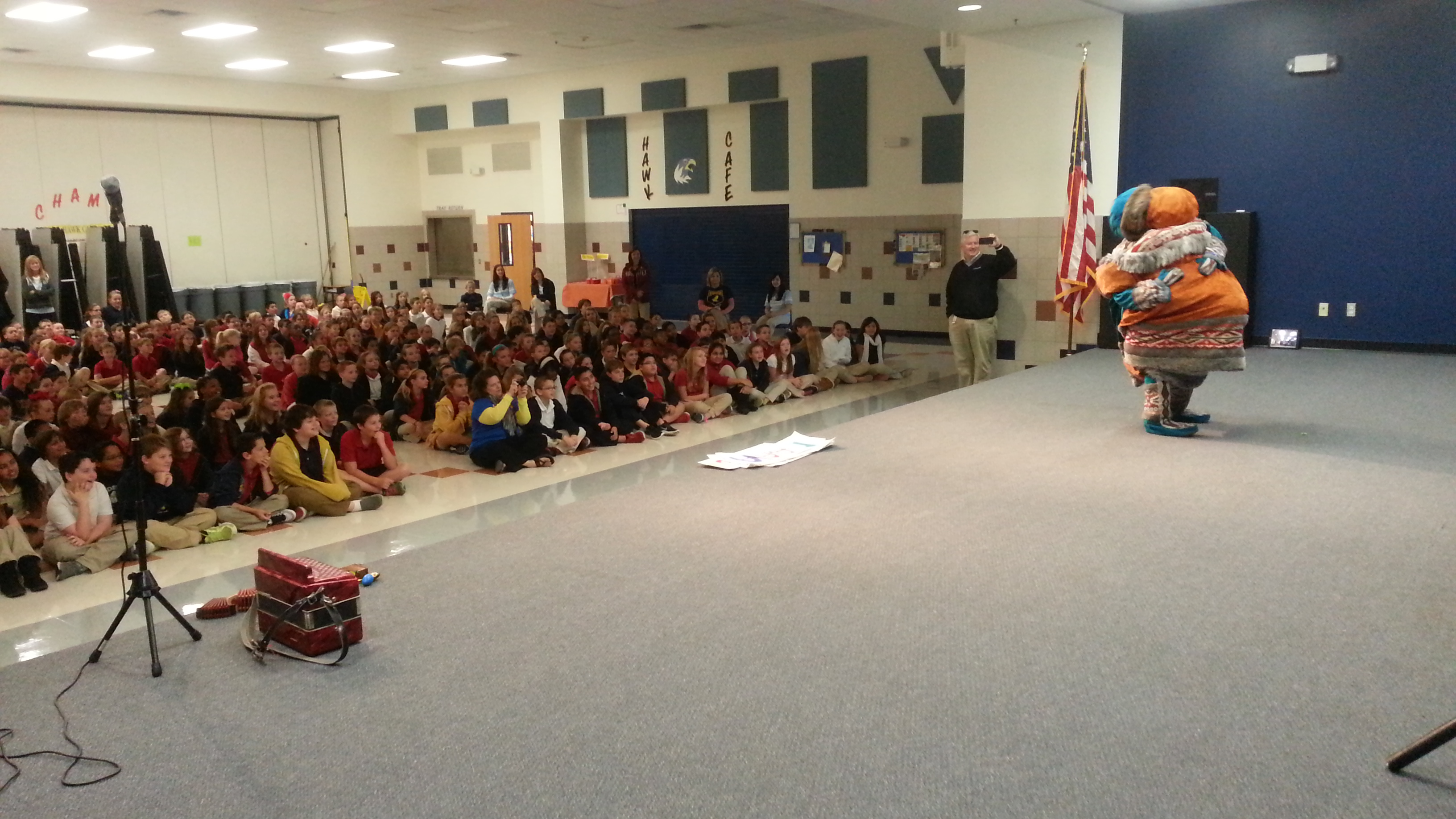 In between playing songs on their instruments, singing songs, and dancing traditional numbers to the music, Mikhail Smirnov shared a little bit of the Russian language with the students. He taught them phrases such as "Thank You" (SPASIBO), "Hello" (ZDRAVSTVUITE), "You're Welcome" (PAZHALUYSTA) and "Bye" (PAKA) as well as the alphabet and counting. He said each word in English and then slowly in Russian, allowing the children a moment to try the words themselves after each one.