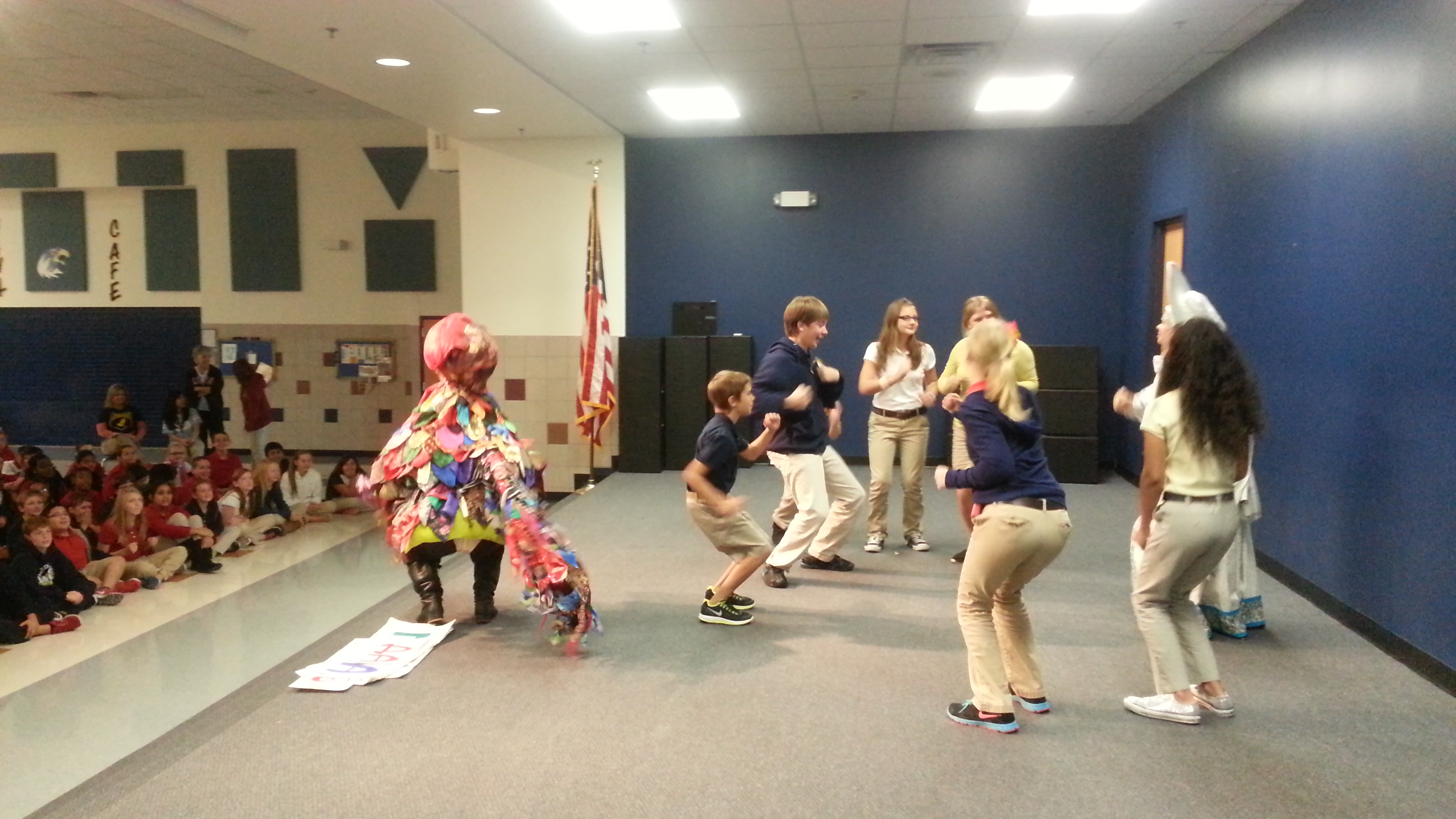After the segment on words, the students attempted to chatter in Russian for a couple minutes, smiling and laughing about how they sounded. Almost in the end of the performance, Mikhail paused to share a couple of Russian tongue twisters, explaining each one in English first, and then saying them in Russian at top speed. With each one, the twisters got more complicated and lengthy. There was even a chance for a handful of students to get up on stage and try out a couple of Russian percussion instruments.