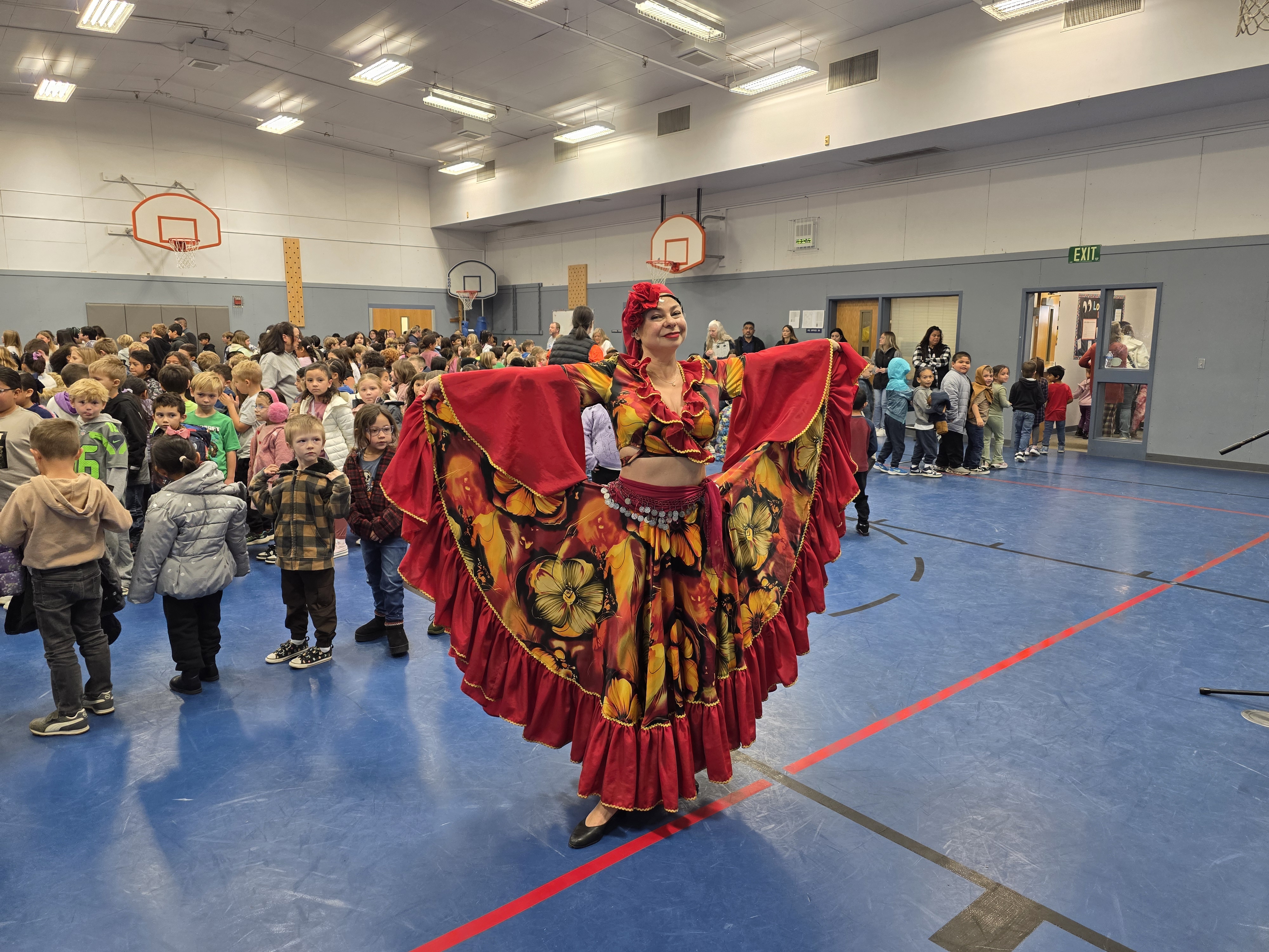 Barynya Trio performed 45 min school assembly program on Friday, November 21st, 2025, 9:30am at Peninsula Elementary School , 2406 W Texas St., Moses Lake, WA 98837. Cast: Mikhail Smirnov (garmoshka, guitar, vocals, costume characters), Serhiy (dancer), and Elina Karokhina (balalaika, domra, dancer).